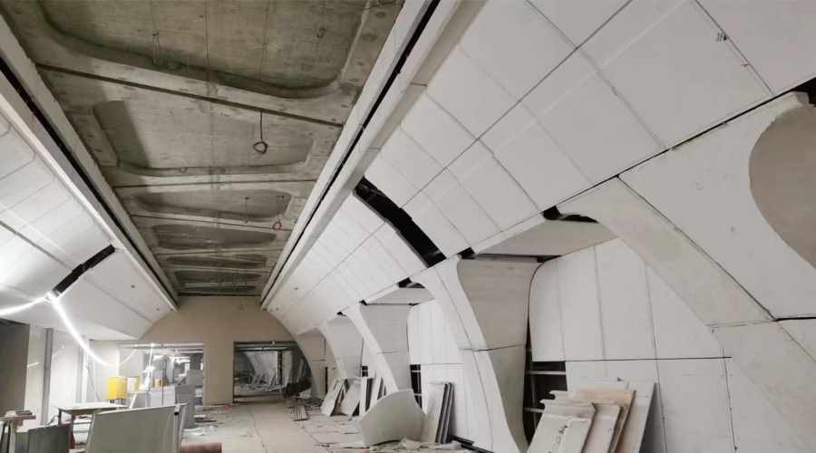 GRG材料本身的輕盈性質(zhì)為吊頂設(shè)計(jì)提供了更大的創(chuàng)作空間,相比傳統(tǒng)吊頂材料,GRG的質(zhì)地輕盈,卻不失堅(jiān)固,使得設(shè)計(jì)師可以更加自由地發(fā)揮想象力,